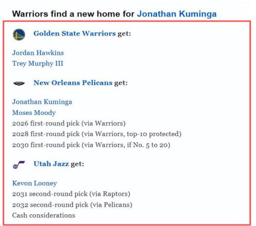 仅一夜,爆勇士三方交易追墨菲!库明加+穆迪搭上3个首轮,值吗
